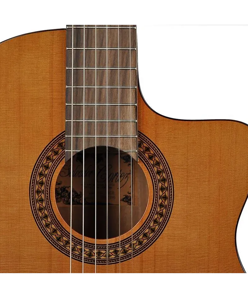 La Salvador Cortez CC-22CE e una chitarra classica amplificata a spalla mancante perfetta per studenti e amatori e per un utilizzo semi professionale. Presenta un sistema di preamplificazione Fishman ISYS-T con accordatore incorporato in grado di restituire facilmente un suono naturale.