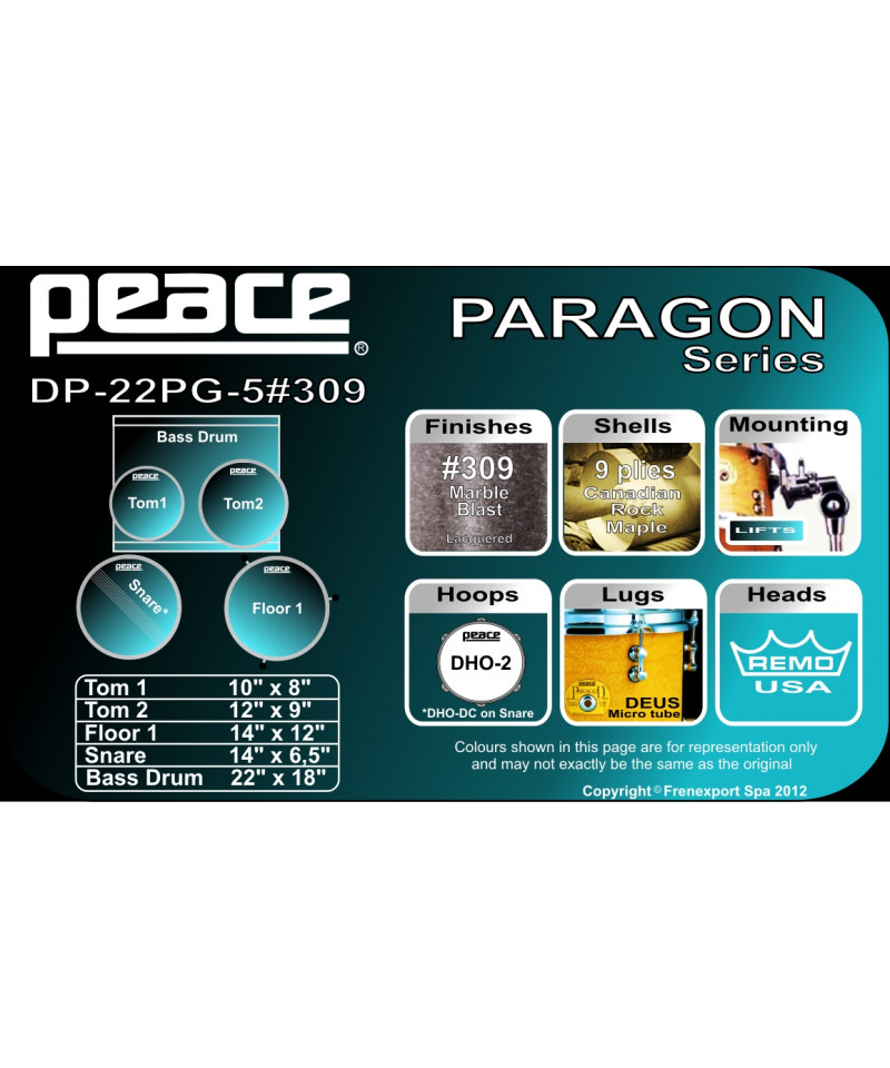 True battery enthusiasts have always choose maple drums. ETherite that the Peace team developed the Paragon series, creating 9-layer Canadian maple drums. Simply "the best of the best". The wide range of measures and leases available to the musician, whether professional or amateur, the ability to customize your set based on the most disparate needs. The use of patented Lifts systems for the support of Toms and Mechanical Deus Microtube They favor a better and easy tuning as well as the possibility of changing the skins with the assembled rid of the ridasta.The captivating look, superlative sound and visibly technological construction make Paragon a series that leaves no room for compromises. Standard packages provide for the supply of only drums together with which all the accessories of the vast PEACE catalog can be ordered separately.