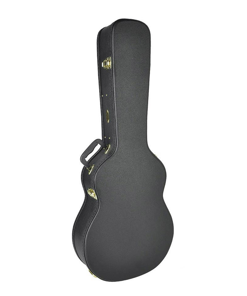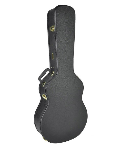 Shaped case for auditorium / 000 acoustic guitar, in wood, black color. Equipped with internal storage compartment.