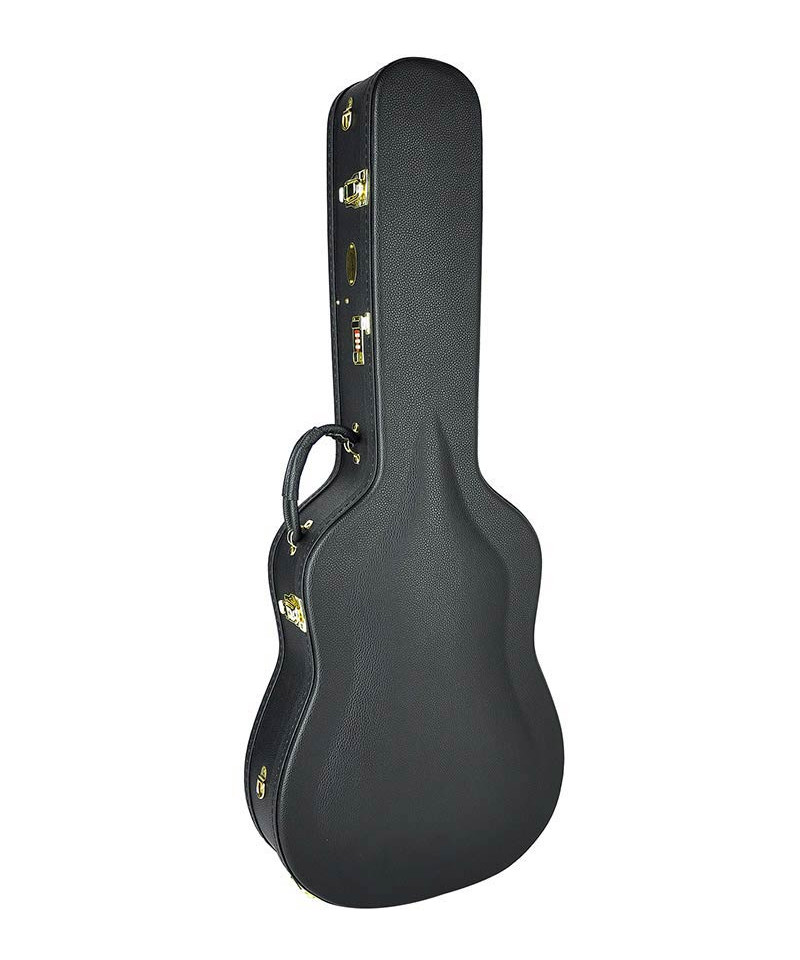 Rigid case for dreadnought acoustic guitar, in wood, with internal compartment holding objects and protective cloth. Equipped with a convenient shoulder strap and closure with combination.