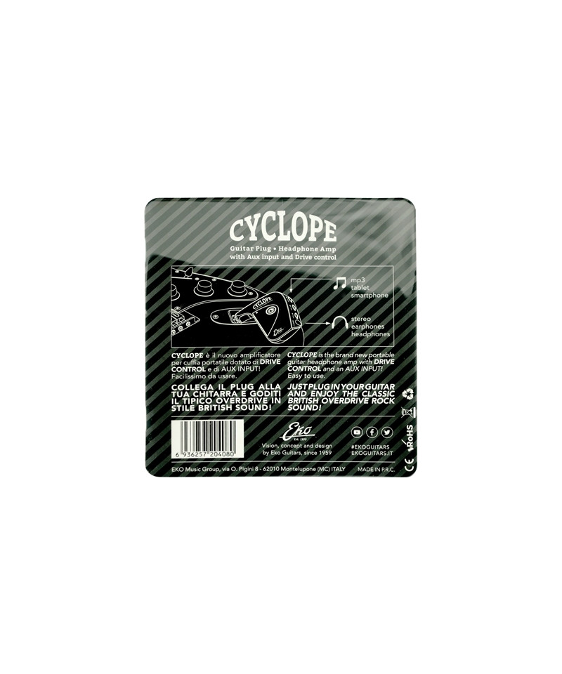 Cyclope is the new portable headphone amplifier equipped with Drive Control and Aux Input! Very easy to use. Connect the plug to your guitar and enjoy the typical British sound-style overdrive. The Cyclope has Gain control, Tone and Level control, plus a useful AUX ingredge to play together with your favorite tracks, or backing track. Thanks to its controls it is possible to have all the sounds of a true amplifier, from clear clean sound, to the lead sound, passing through tasty crunches.