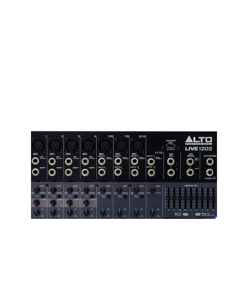The High Professional Live 1202 mixer provides 8 channels, of which 4 mono with XLR microphone and line (¼ "jack) inputs, on which we find an insert connection to connect signal or multi processors-Effects, three stereo channels (5/6, 7/8 and 9/10) with inputs Jack (L and R) from 1/ 4 ", possibly benefited as additional mono inputs seen the presence of the microphone XLR connector. It closes with an additional channel - 11/12 - Stereo equipped with ¼ "L / R Jack inputs. The channel strip of each channel provide, in addition to the 6cm fader: gain control, high pass switch (only where XLR input is present), 3-band equalizer, pan and the two sent respectively to the auxiliary output (aux Send) and to multi-Integrated effect. On the first four channels there is rotary control for the application of the compressor. For both sends, on the right of the mixer there is the respective return control fader (DFX RTN and AUX RTN).