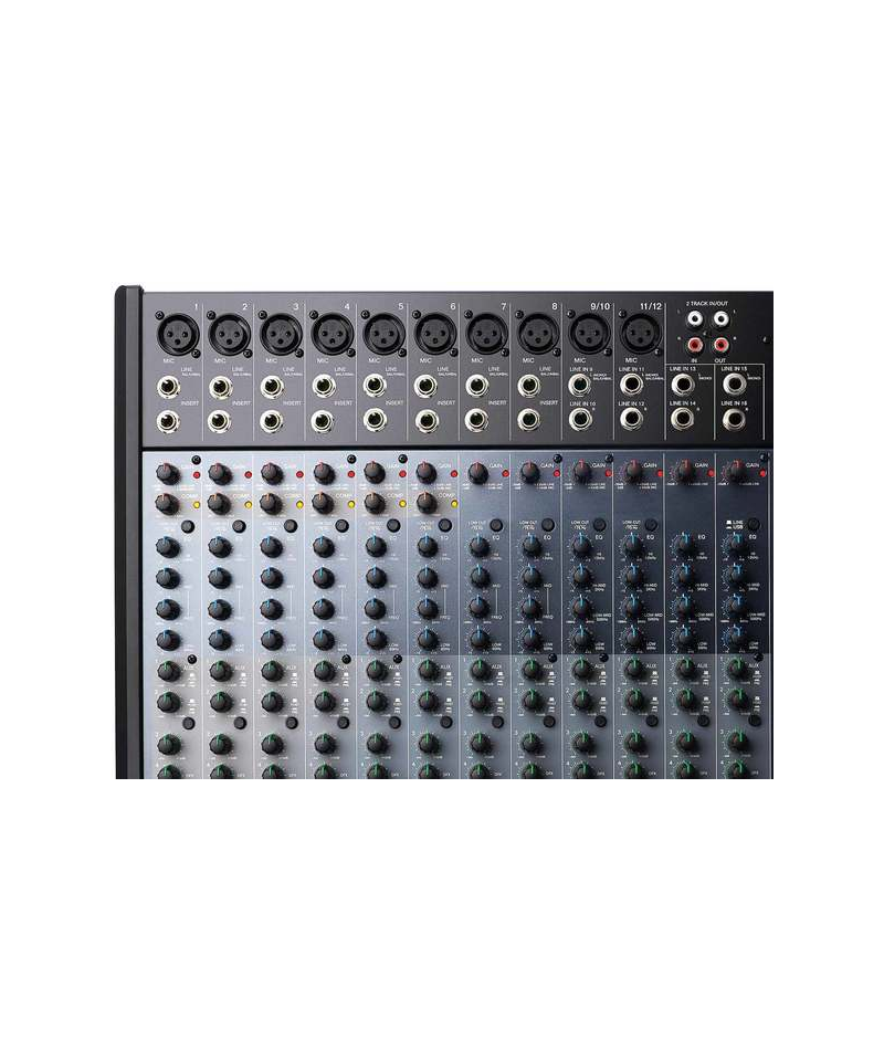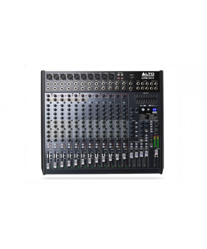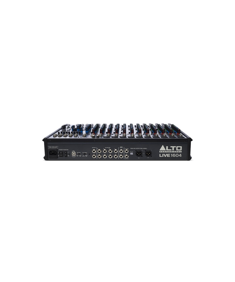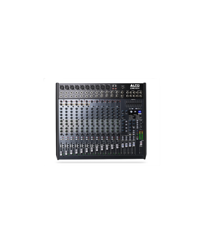 High Professional Live 1604 A 12-channel mixer, of which 8 mono with microphone and line XLR inputs on which we find the insert connection to connect signal or multi processors-External effects, in addition to an integrated individual compressor only on the first 6. 2 stereo channels (9/10 and 11/12) with jack (L and R) inputs by 1/ 4 can eventually be used as additional mic mono channels seen the presence of the microphone XLR connector. It closes with two other channels (13/14 and 15/16) equipped only of l / r jack from. The channel strips of each channel provide, in addition to the 6cm fader: gain control, high pass switch (only present XLR input), 3-band equalizer with medium sweep on mono and 4 bands (bass, medium bass, high and high medium) on stereo, pan and four mandates dedicated to auxiliary outputs (Aux Send) and multi-Integrated effect, and the mute and only buttons. On the first 6 channels the rotary control for the application of the compressor is present. For all sends, on the right of the mixer there is the respective rotary potentiometer for the return control. The mixer provides 4 sub-Groups (bus).