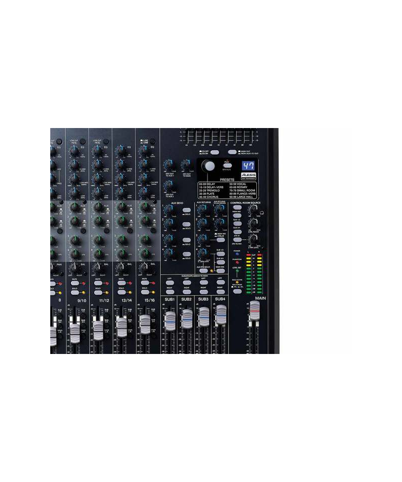 Other plus of this multi-series mixer-Integrated effect designed by Alesis. This is a signal processor at 24-Bit with 100 DSP effects available among which user Potr selects the one applicable via delivery to the various mixer channels. In the Effect Equipment we will find various reverb algorithms, delay, flanger, Chorus, tremolo, etc. also available in the form of effects combinations (delay / reverb, for example) or pre-Settated by field of application (Vocal).