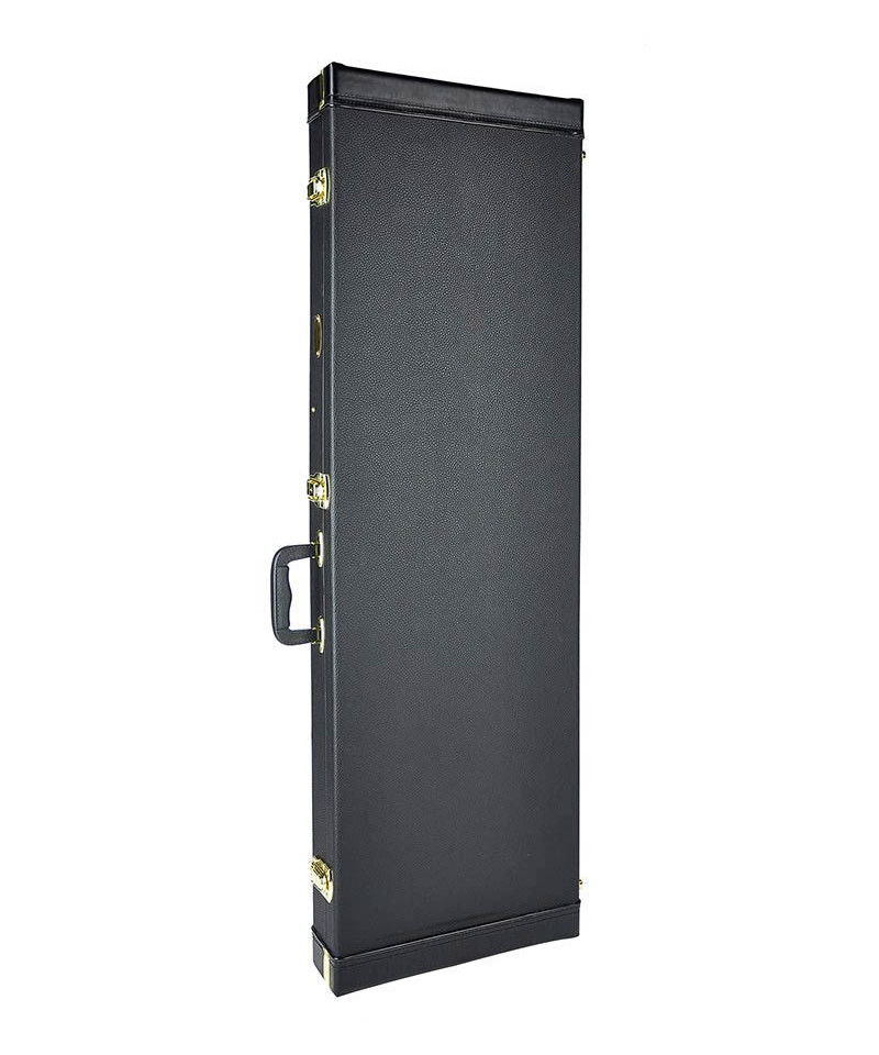 Electric bass case, wooden, black. Rectangular model. Equipped with a large internal door compartment.