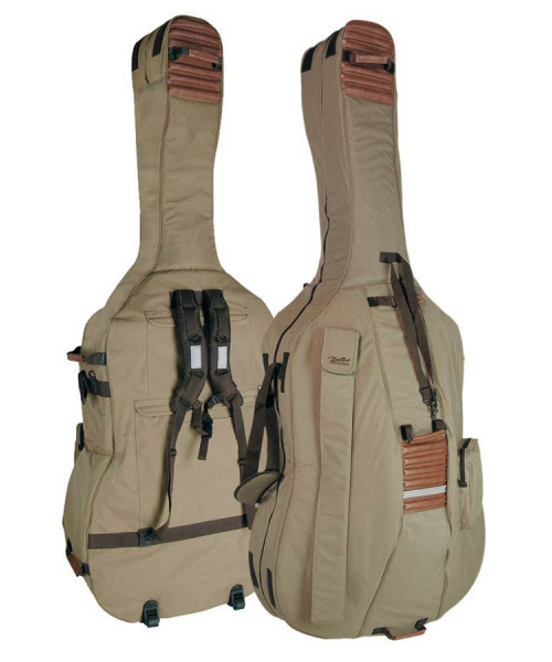 Padded bag for 4/4 double bass, 23mm padding, equipped with 2 shoulder straps, a pocket for accessories and 2 wheels. Beige-brown