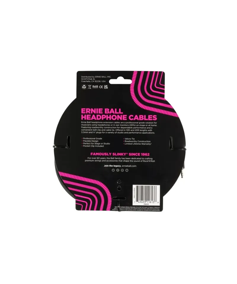 The new Ernie Ball headphone prolong cables are a professional level solution for musicians using headphones or monitors in-Ear (IEM) on stage or home to practice or record. They are characterized by a robust structure for reliable performance and can be hooked through a comfortable belt clip and a supplied clamp. Available in 3 and 6 meter lengths, with 3.5 mm connectors and 1/ 4 "For a variety of studio and performance applications. Connect and stay connected with the Ernie Ball extension cable line.