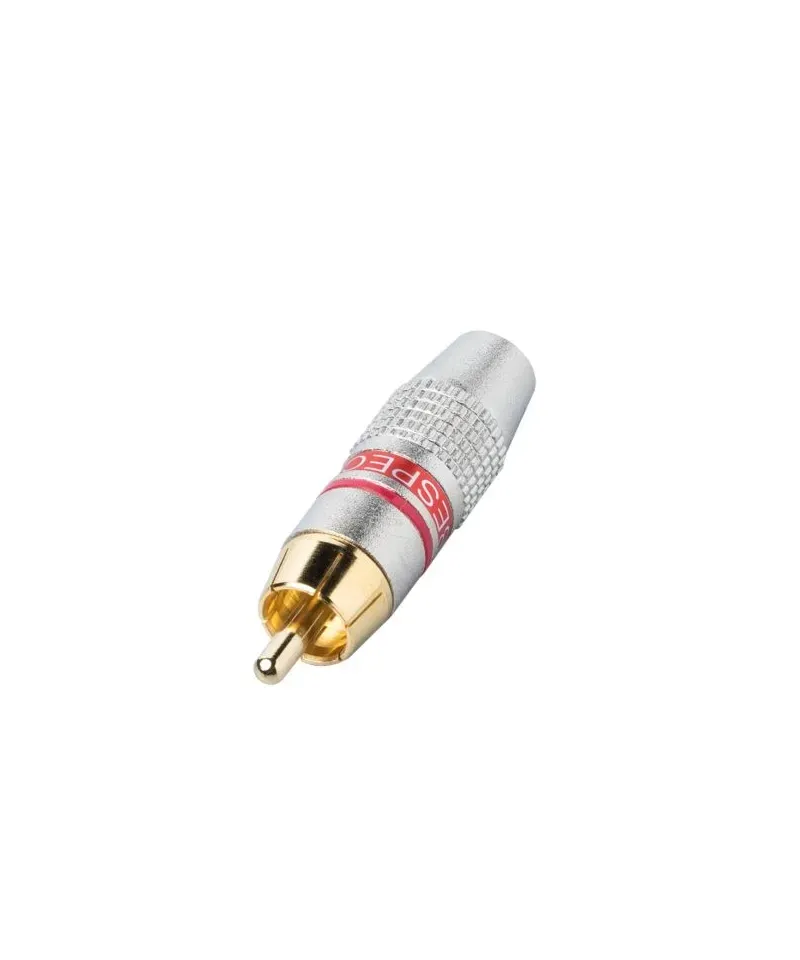 Golden RCA plug connector with nickel-plated brass body. Red color index.