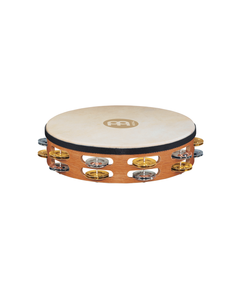 10 '' wooden tambourine with a precompressed natural head and 2 rapes of steel and brass rattles. Wooden tambourine with a diameter of 25.4 cm. Vintage design, brown walnut finish.