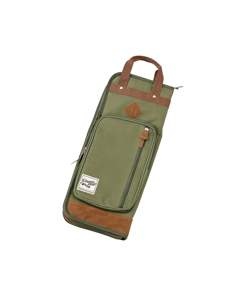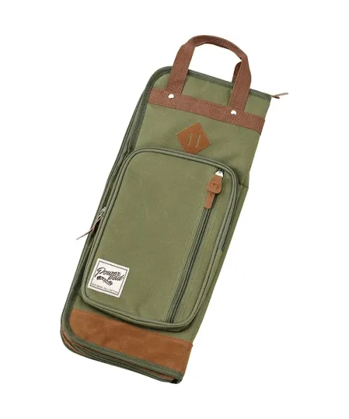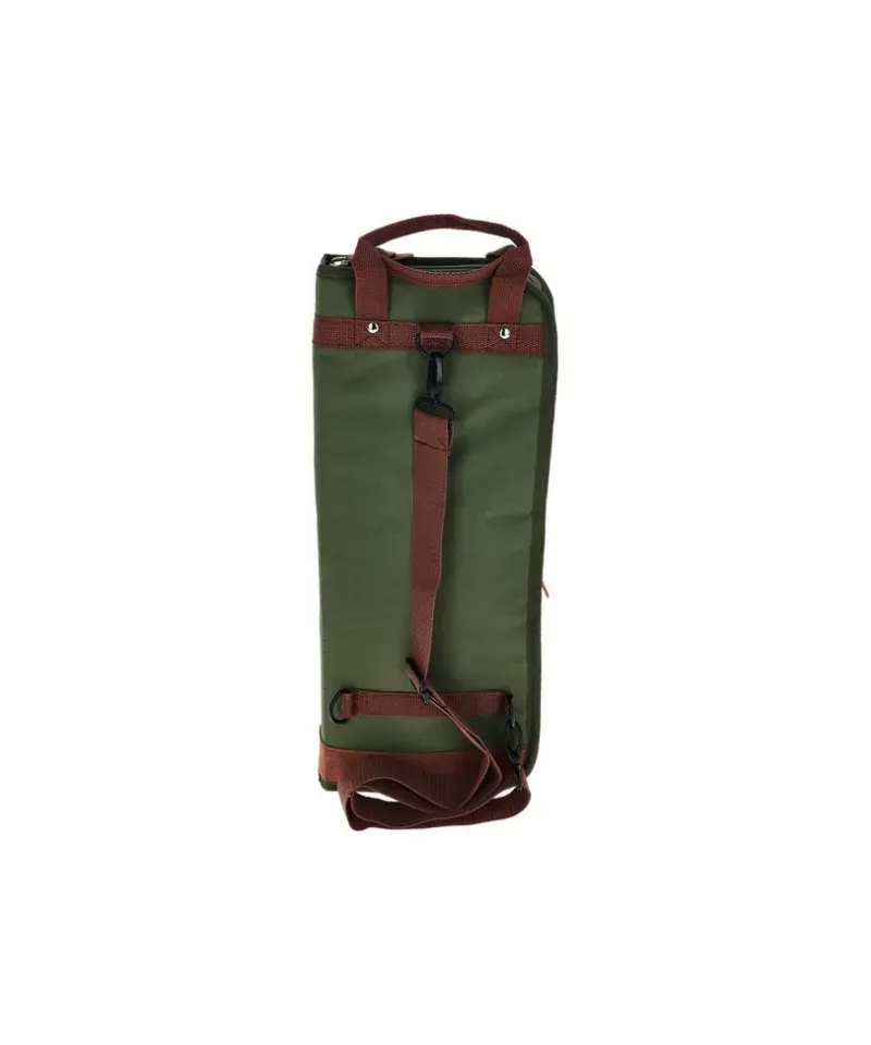 Chopsticks, Mallet, Brushes and the like, up to 12 pairs. Equipped with two hooks to anchor the tympanum case, internal and external pockets for accessories, handle and shoulder strap for transport. Color Moss Green with brown colors