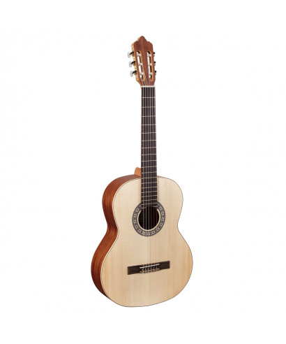 With the Europa Toledo series launches its classic guitars entirely built in Europe. Julia 44COP A 4/4 classic guitar with solid top in fir and mahogany background / bands. Characterized by a full and full-full sound, it counts on a set-Meticulous up that guarantees perfect play even to the beginner. Embellished by a satin-finished open-poore finish and gold mechanical, a tool from great value in its market band.