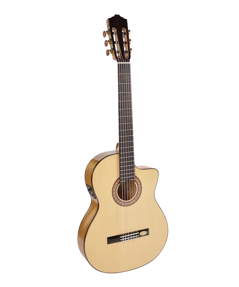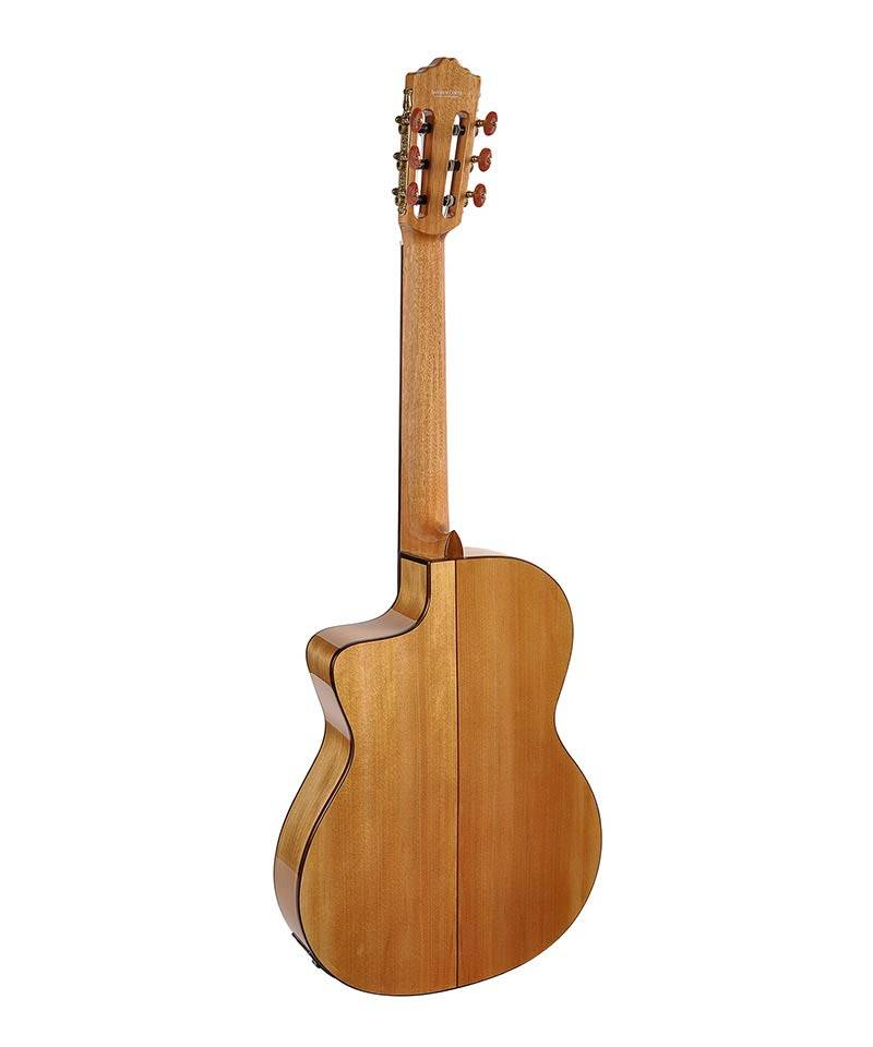 The Salvador Cortez CF-55tce A flamenco guitar amplified to missing shoulder, made of high quality European solid spruce and seamless bands and bottom. The narrow case makes it all easier when standing sounds reducing weight and increasing lergonomics, the missing shoulder facilitates the most virtuous picado in the acute part of the keyboard while the preamplification system brings flamenco sound in the studio or live.