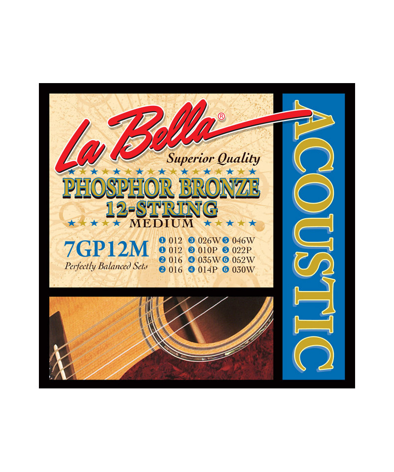 It guarantees a brighter sound and a longer life than any other bronze phosphor set on the market. 12 strings. Medium tension. Scaling: .012-.012 - .016-.016 - .026w-.010 - .035-.014 - .046-.022 - .052-.030w. Produced in USA with American cable. Packaged using MAP (Modified Atmosphere Packaging) technology to prevent oxidation and guarantee freshness.