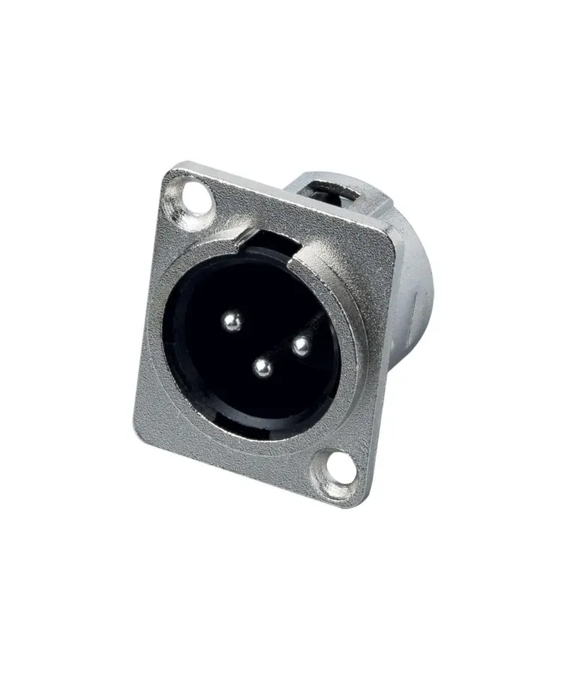 3-pole male cannon connector from panel with metal body flange step by "D". Locking system, weld connections.