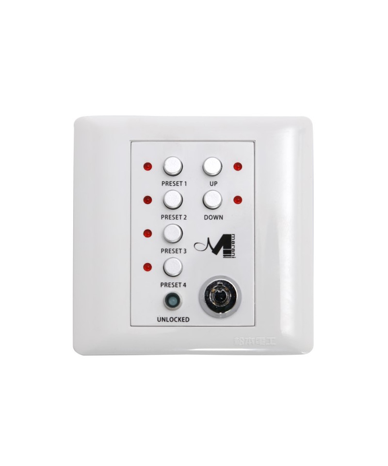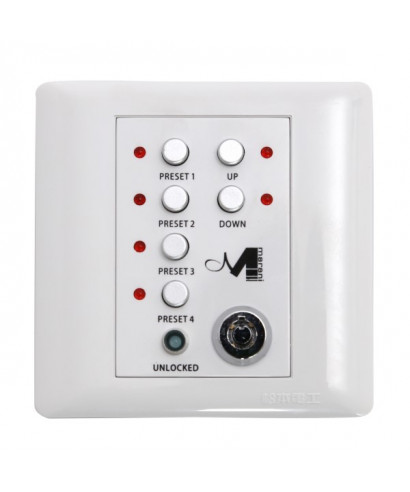 The CP4 mural accounter was designed for Remote control of Speaker Management Marani DPA880T and DPA880ATM via RS485 protocol. CP4 is able to recall and manage up to 4 presets stored on the host machine. The LED associated with the selected preset flashes up to loading the executed preset, then stays on. With the CP-4 You can adjust the master volume. Volume variations take place by degrees of 1 DB, so as to avoid incorrect changes too fast. A key switch allows you to put the lock controller once the setting has been finished so as to prevent use of unauthorized personnel or avoid accidental setting changes