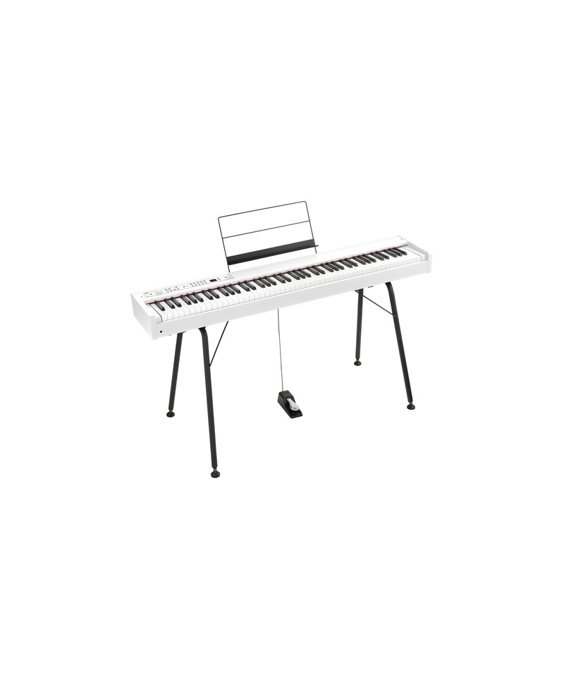 The Stagekorg D1 piano, ultra-thin and exceptional sound, now available as well as in the original black version, even in a new white variant. With the sounds 30 high quality sounds, complete with pedal and lectern, D1 in both finishes a digital stage plane from the unmistakable line, which combines the great executive feeling, sound and portability.