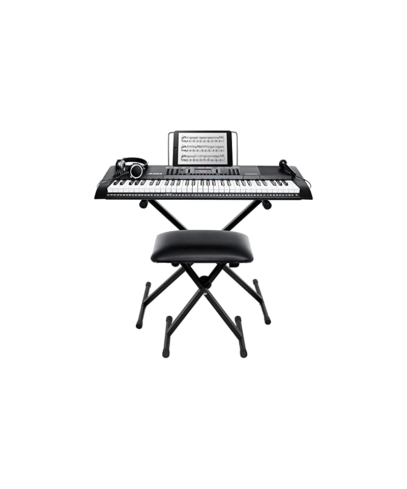 The Alesis Harmony 61 keyboard offers 61 floor-Style, integrated speakers and over 300 built-in realistic sounds covering a wide range of tools - Pianos, arches, brass, winds, percussion, mallets, guitars, synthesizers and even sound effects. E'Possible superimplace the sound together in the "layer" mode or divide two sounds on the keyboard in "split" mode. Harmony 61 also has 40 tracks incorporated with easy learning tools and 300 integrated accompanying rhythms that allow you to instantly create tracks in a wide variety of genres. You can even record your songs using the "Record" mode. Harmony 61 Mkii includes all the accessories needed to start and learn to play today. Harmony 61 Mkii is supplied with an easy to assemble support, a bench with three height adjustments, headphones that automatically disable speakers for private tutorials, a lectector to hold sheet music, a power supply and even a Microphone to sing while sounds.