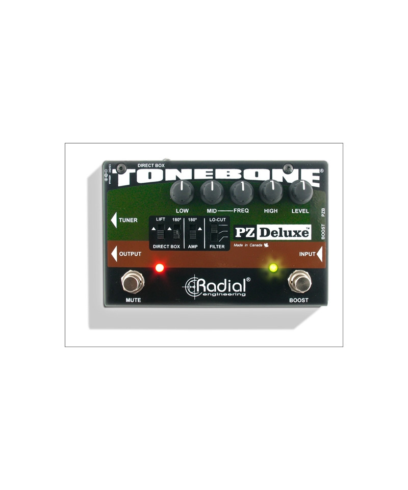 The RADIAL PZ-Deluxe A study preamplifier for instruments that brought together a complete set of functions in a compact pedal for live use. E Like most studio preamps, the pc-Deluxe starts with a front-Low noise end that capable of exceptional dynamics to adapt to all instruments, including acoustic guitar, double bass, mandolin and violin, no matter what type of pickup system-Up is used. For piezoelectric transducers, a special PZB gain stage can be activated to increase the 10 meg entrance impedance-Ohm to eliminate squawk and explosive peaks that are common with other systems. This eliminates the need for a separate preamplifier - What particularly important for those who do not want to make a hole in their vintage guitar.