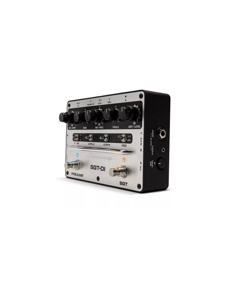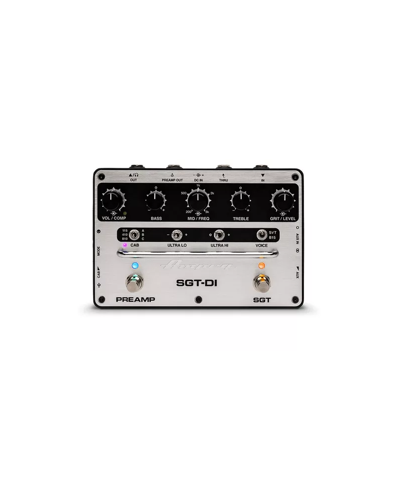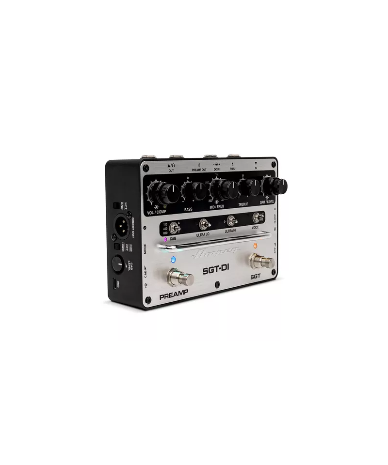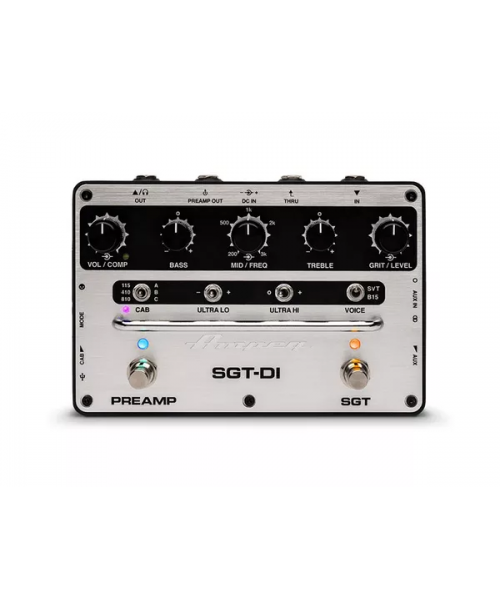 The preamplifier and the SGT-Of offering modern rig in a modern stompbox. It offers an upgrade overdrive circuit with Super Grit technology with Iconic Voices AMGEG SVT and B15, Versatile EQ 3-band now with adjustable mid circuit, ultra switches-Hi and Ultra-3-way, a variable compressor and an aux / headphone section. More! There is the first IR Loader / CAB Simulator of Ampeg. Choose from three classic factory cabinets or up to three personal cabinets using the free AMEG IR Loader application.