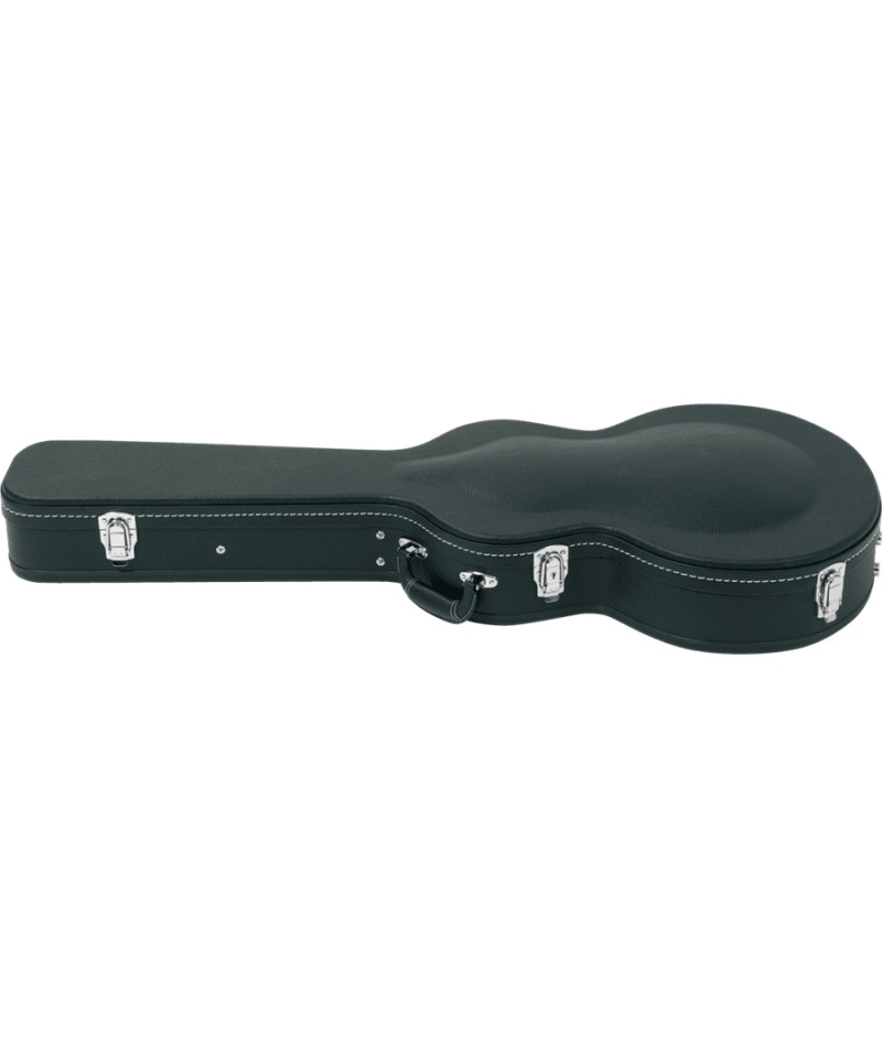 HTO SJ5 A wooden slim jazz guitar case of the Tobago deluxe series. Characterized by a curved top and a perfect shape for a slim jazz style guitar, covered in black leatherette, with black interior. Internal dimensions: 107 x 41.5 x 30.5 x 14.5 cm
