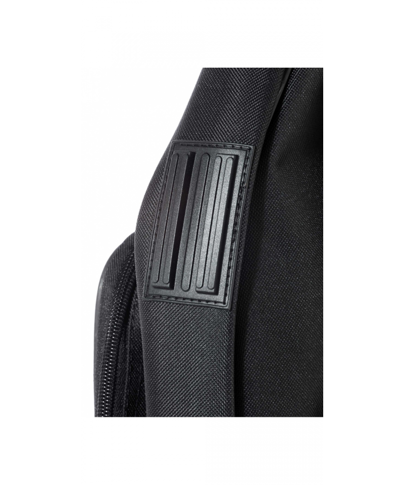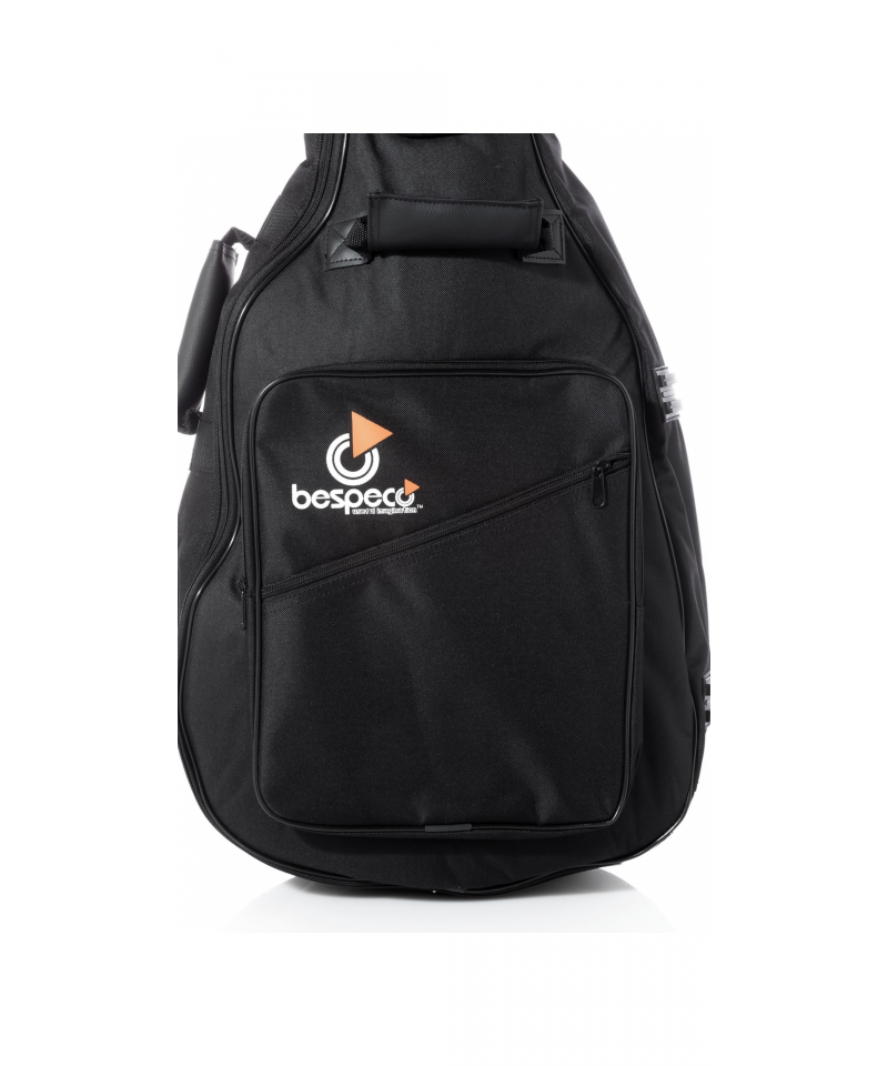 Former Line series soft bag for electric guitar, with 15 mm padding. Made of "Oxford Cloth 600D" tear-proof and PVC edging, black color. Upholstered handle. Adjustable double shoulder strap and extensive front and upper pocket. Natural rubber bumper pads. Sturdy zipper sewn with tear-proof nylon. Rear hook. Internal reinforcement to protect strings and bridge.