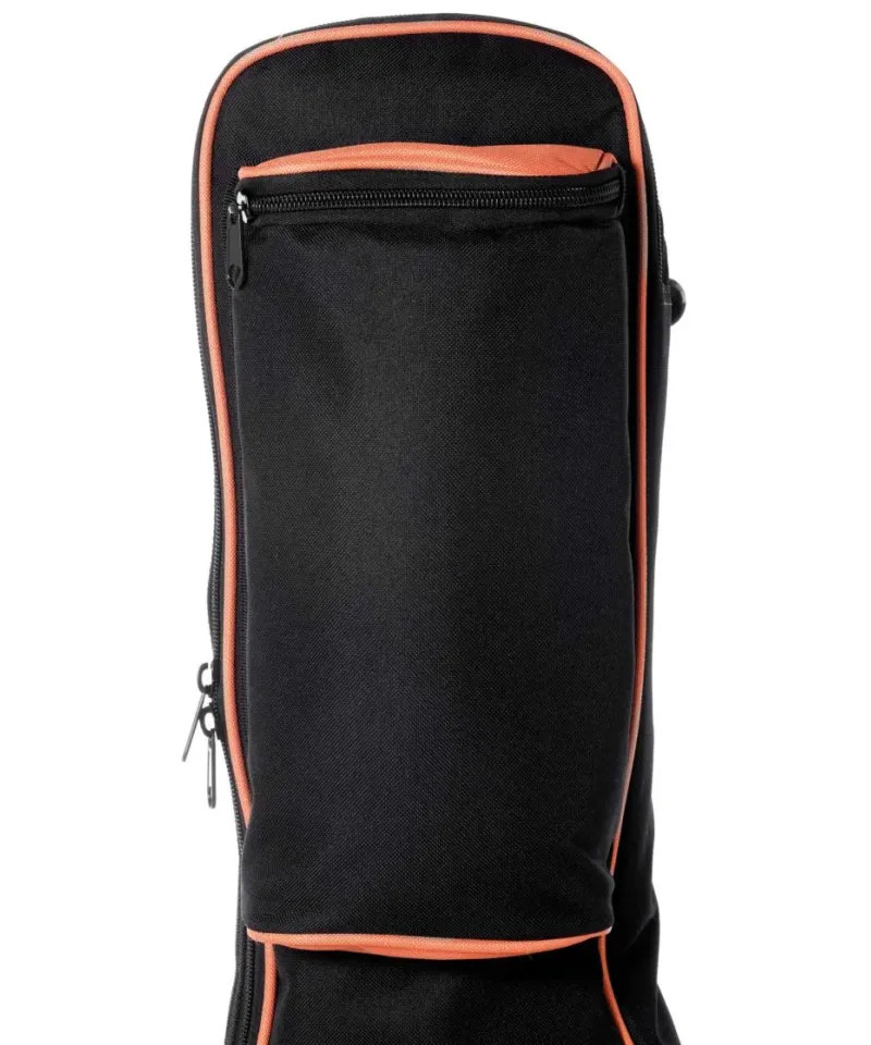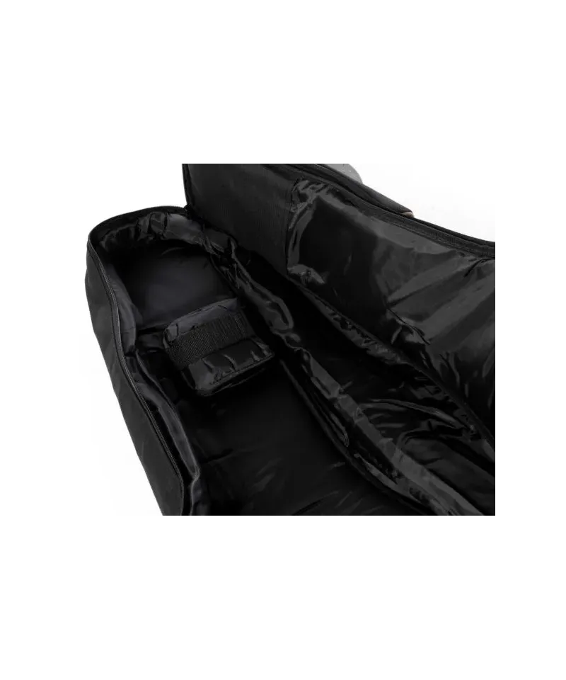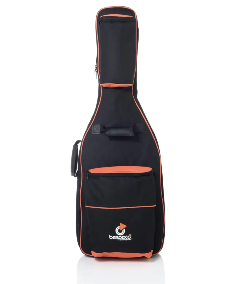 For electric guitar. 35 mm padding. Made in "Oxford Cloth 600D" tear-proof and edging in padded sheet tape. Black color + orange. Padded manhelle. Double adjustable retractable shoulder strap, with professional carabiners. Wide front and upper pocket. Sturdy zipper sewn with tear-proof nylon. Rear hook. Internal reinforcement to protect strings and bridge.