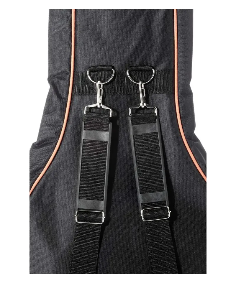 Soft line color line for electric guitar, with 10 mm padding. Made in "Oxford Cloth 600D" tear-proof and PVC edging, black + orange color. Upholstered handle. Double shoulder strap adjustable with professional carabiners and large front pocket. Natural rubber bumper pads. Sturdy zipper sewn with tear-proof nylon. Internal reinforcement to protect strings and bridge.