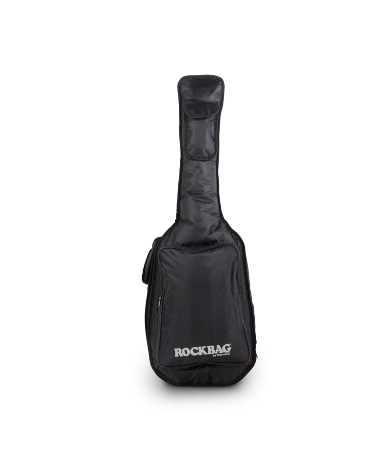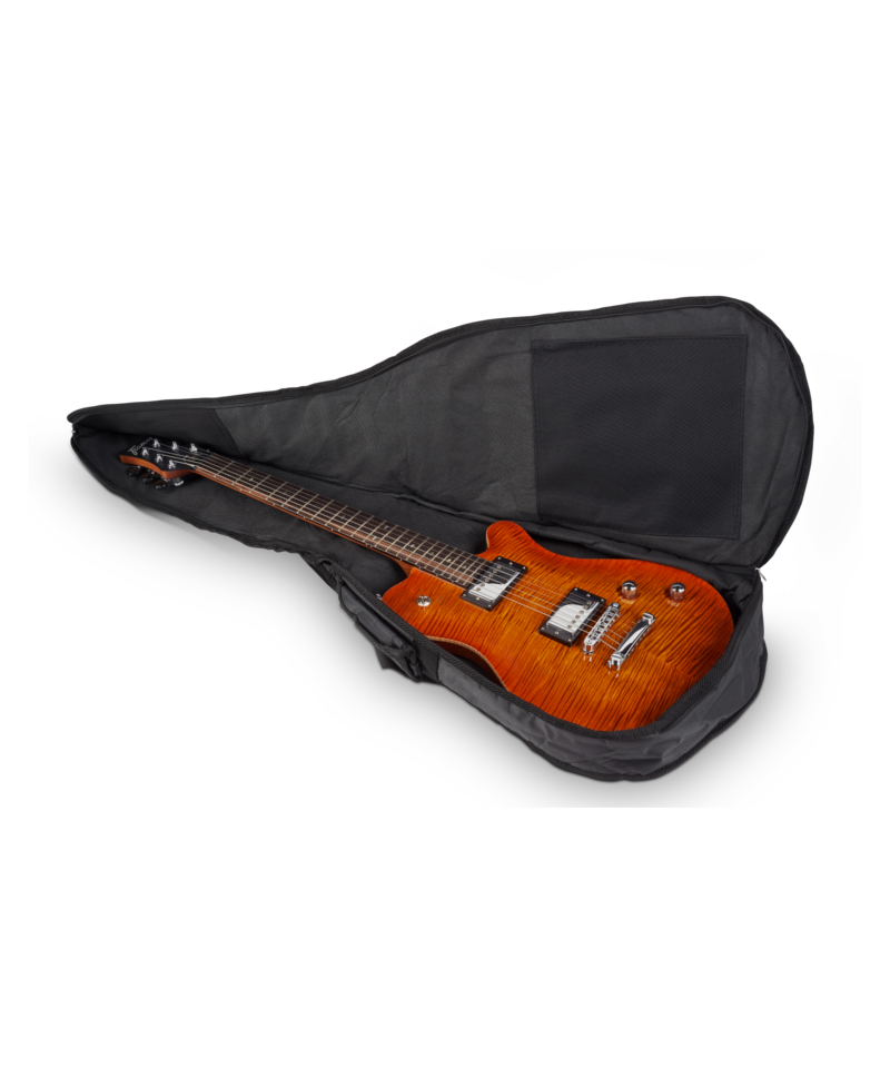 RB 20526 B - Upholstered bag for electric guitar - Basic series - Made in robust water-resistant Roktex fabric - 5mm padding - 0.5cm wide 2-way zip with nylon hinge - Black nylon lining with reinforcement at the pallet and the bridge - Wide external front pocket with zipper - External pocket at the scoop - Upholstered transport handle on the side - 2 adjustable shoulder straps with PVC hardware - Plastic ring to hang the bag.