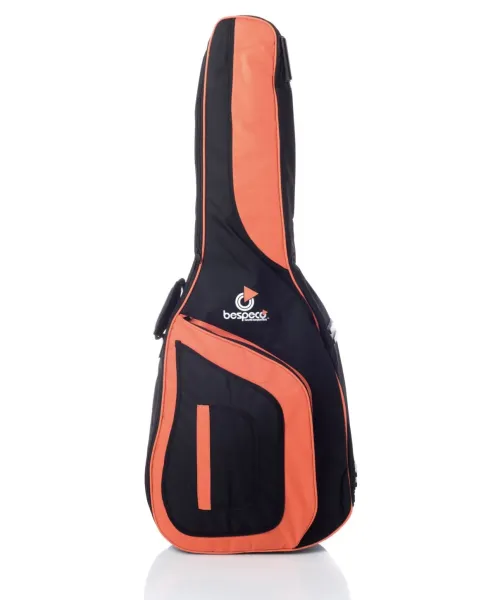 Soft color LINE series bag for acoustic guitar, with 10 mm padding. Made in "Oxford Cloth 600D" tear-proof and PVC edging, black + orange color. Upholstered handle. Double shoulder strap adjustable with professional carabiners and large front pocket. Natural rubber bumper pads. Sturdy zipper sewn with tear-proof nylon. Internal reinforcement to protect strings and bridge.