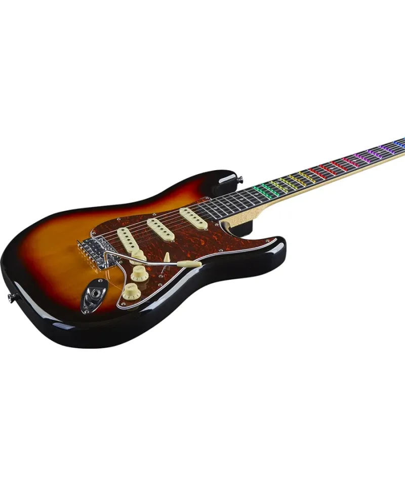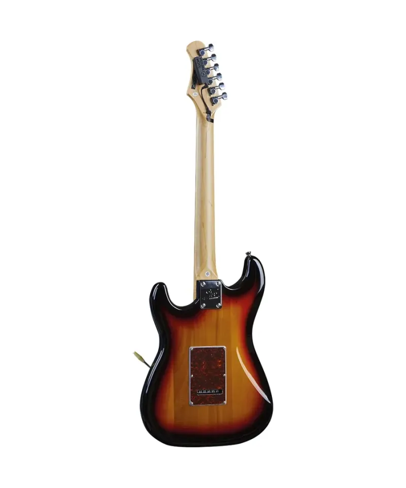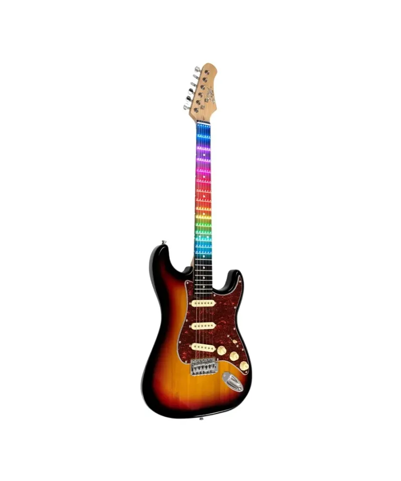 S-300 Sunburst Visual Note The electric guitar of the "Visual Note" series of home Eko Guitars with carbonized poplar body, maple handle and Eko WPC resin keyboard with a Visual Note LED laminating laminating with the app with the app Dedicated. E'Equipped with eko pickup in SSS configuration, volume controls and two tones, 5-way switch blade switch and bridge with tremolo lever. In the app there are videos lessons, exercises, tuner, staircases and arpeggies that are transferred in real time directly on the keyboard LEDs to drive the user in a fun learning.