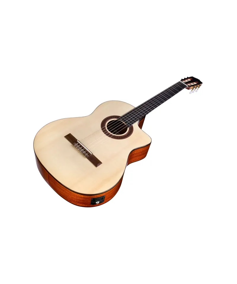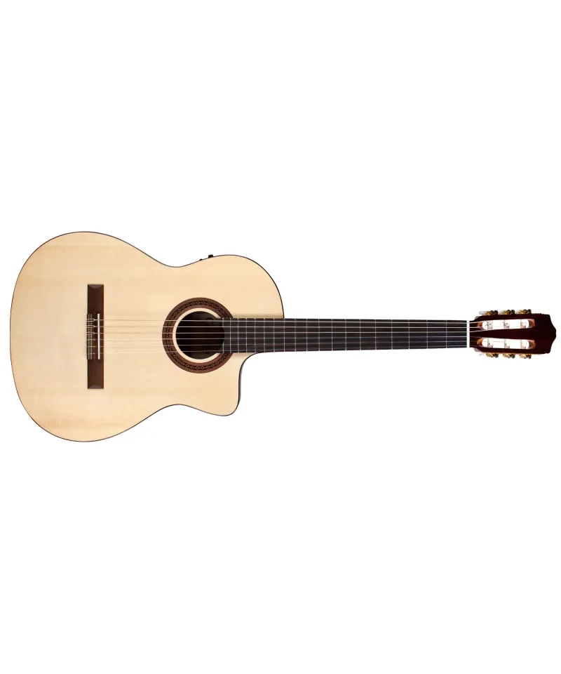 Based on the C5-CE, the best selling of Córdoba, the C5-Spruce adds a new option to one of the guitars preferred by fans. The Soft Cutaway facilitates access to the upper register and the Fishman Presys II preamplifier amplifies the signal for stage and study. Perfect as the first nylon string guitar and ready for concerts, this light model is built with a top in Solid Sgelmann fir and mahogany bottom and bands to produce a clear and powerful sound with a beautiful sustain. Handmade in the traditional Spanish style, the carved c5 scoop, the wooden rosette inlaid by hand, the indian rosewood binding, the savarean ropes and the polished pu finish give a guitar that stands out from All other basic options. A light adjustable Truss Rod is integrated into the handle to ensure stability. Available in the natural finish with solid engelmann fir tops.
