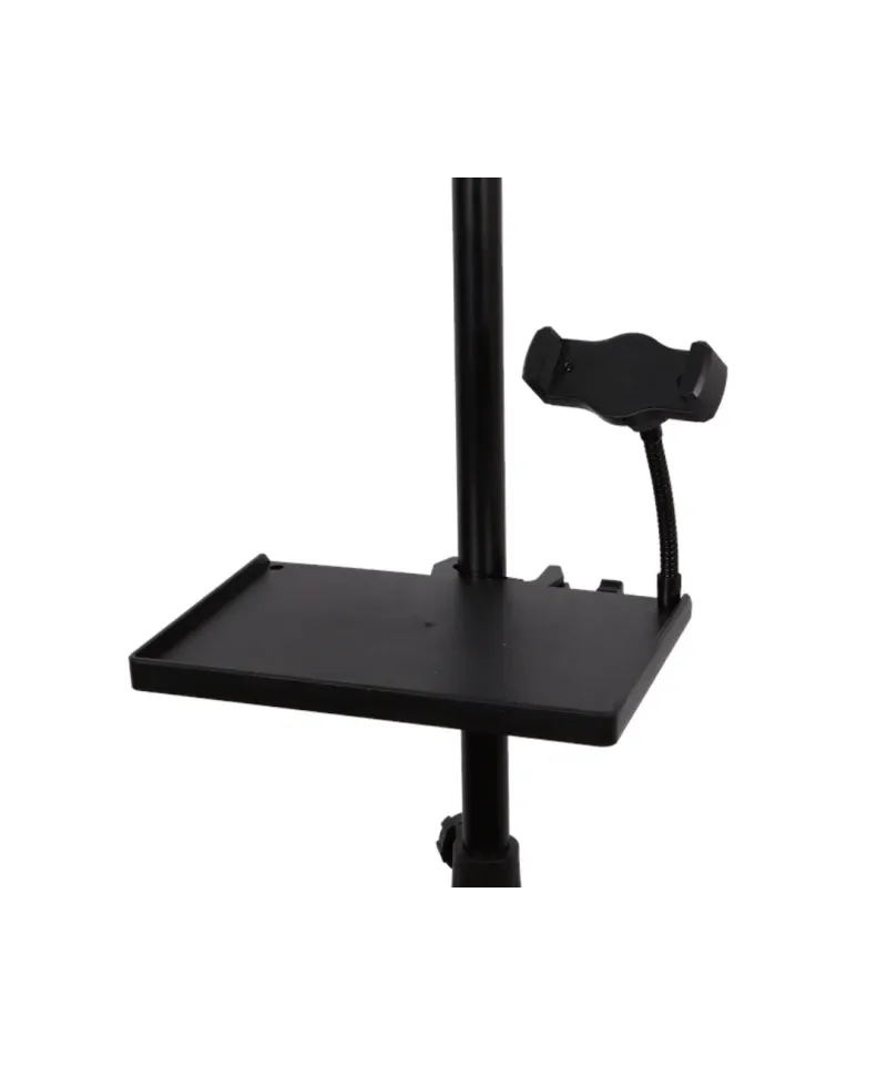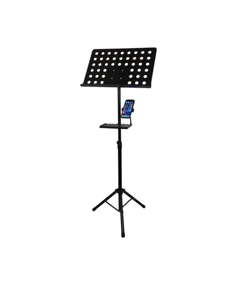 Indispensable for anyone who serves a lectern, with adjustable telephone terminal for any phone. The phone clamp can be fixed both on the left side and on the right side. Since the phone has become indispensable, it is now always visible during the tests or stage. Furthermore, there is obviously space for a drink, the headboard, the tuner, the plettri, etc.