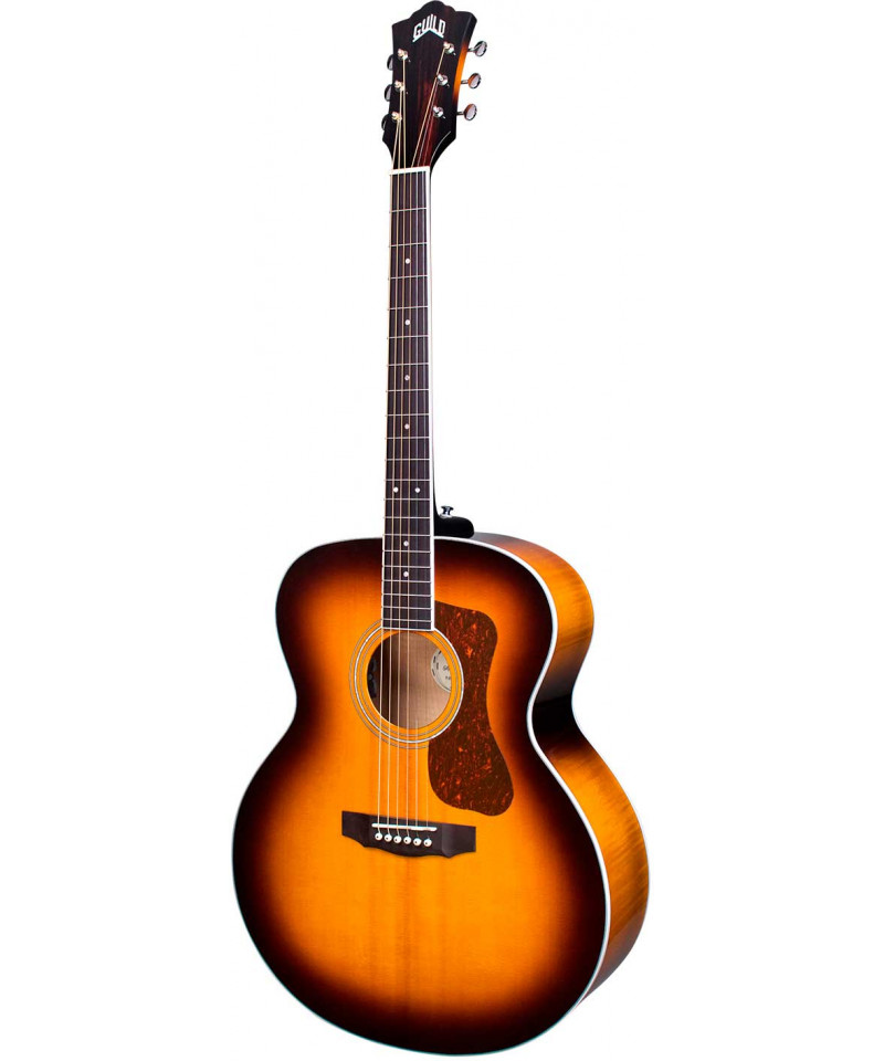 Add to Little Something Extra To Your Acoustic With The New F-250E Deluxe! This Jumbo Guitar Features at Solid Spruce Top With a Stunning Arched Flamed Maple Back and Flamed Maple Sides. This tonewood gives the f-250e in Loud, Crisp Voice With in Sustained Tone While at Gloss Finish Highlights Its Striking, Patterned Back. Premium Appointments includes Mother-of-Pearl Rosette and Guild Peak Headstock logo, Pau Ferro Fingerboard and Bridge, and Fishman Sonitone Pickup with Volume and Tone Controls.