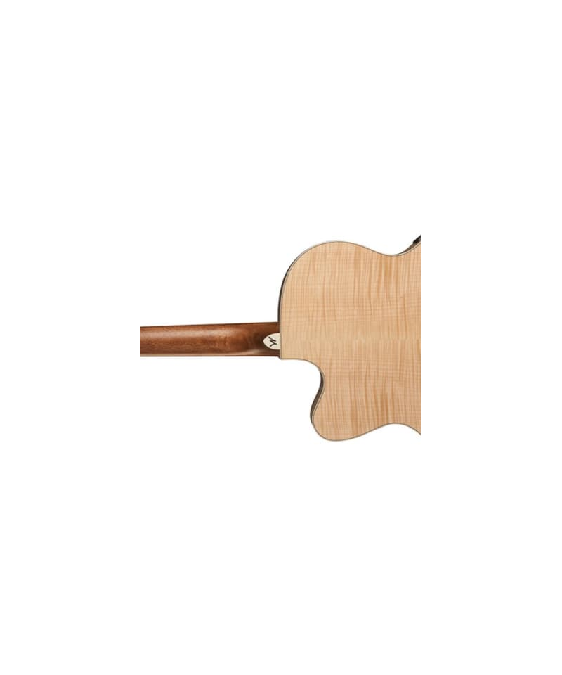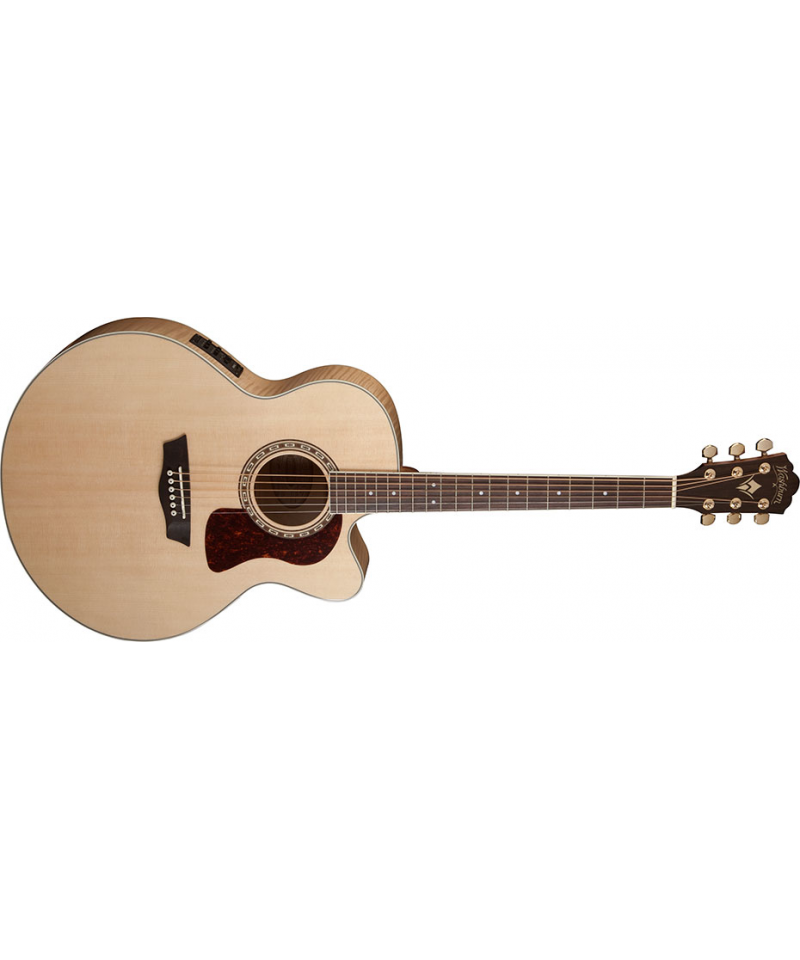 The J40Sce is an electrified jumbo acoustic guitar missing shoulder. It is equipped with a solid Sitka Sitka top top with Cathedral Peaked Scalloped reinforcement-X, beautiful flamed maple bottom and bands, mahogany handle with keyboard and bridge in Ovangkol, golden die-cast mechanics, tortoise battenges and a rosette Washburn Heritage. The J40Sce is equipped with a visually stunning flamed maple for the bottom and the bands. Maple is a wood with a brilliant sound that works perfectly with the style of the Jumbo body, raising the quality of this guitar, great from the powerful sound. The guitar mounts the Fishman Presys + 501T preamplifier. This preamplifier provides a very natural amplified acoustic tone and has volume controls, low, medium, high and brilliance in addition to a phase switch and a notch control to manage feedback emission.
