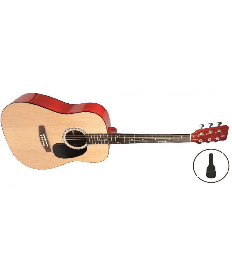 Dreadnought acoustic guitar. Linden case. Lily band and cash. Keyboard in acero.Manico And bridge in 'Compound Rosewood'. Pallet die-Chrome cast. Finish naturale.Custodia included.