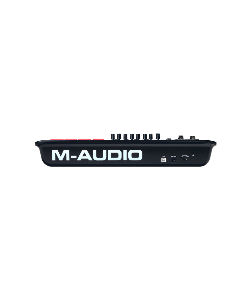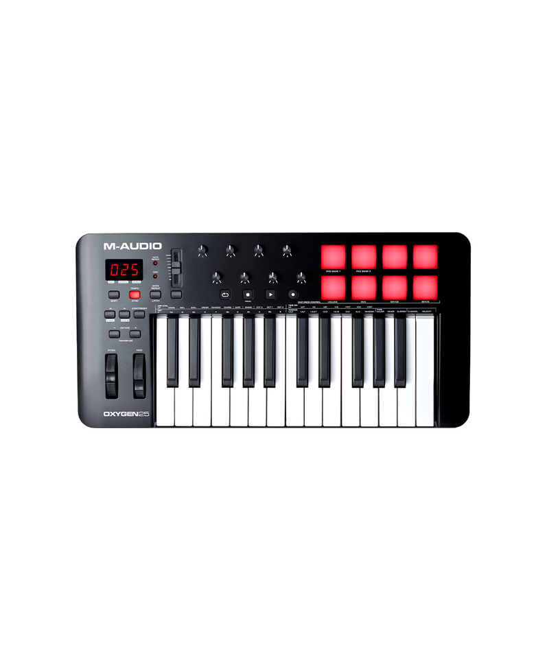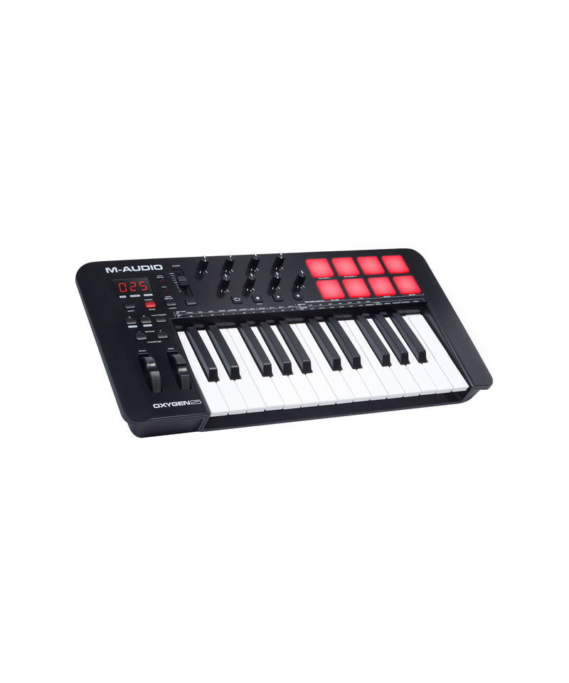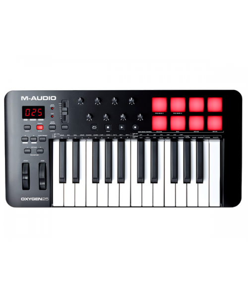 The Oxygen 25 MKV is equipped with two benches of eight trigger pads sensitive to speed backlit with REPEAT notes for the production of beat and finger drumming. Eight assignable knobs are available for the control of virtual tools and plugs-In and a assignable fader for the mixing of productions.