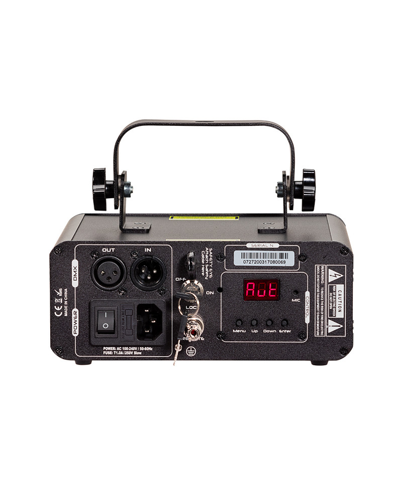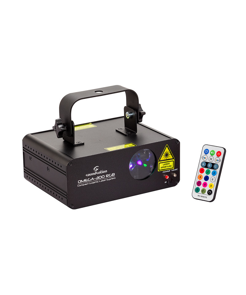 SOUNDSATION Omega-300 RGB IS A New Class 3B Professional Graphic Laser Projector Based on State-of-the-Art Technology. IT FEATURES HIGH-Quality LED RGB Laser Emitters That produces Bright Laser Beams and Smooth Patterns. LED Panel Menu, and The Handy Remote Control Make This Fixture Extremely Easy to Program and Convenient To Use. IT IS THE RIGHT CHOICE FOR ALL THOSE MUSICIANS, DJS AND SMALL RENTAL COMPANIES WHO NEED A RELIABLE AND VERSATILE INSTRUMENT FOR GRAPHIC LASER EFFECTS.
