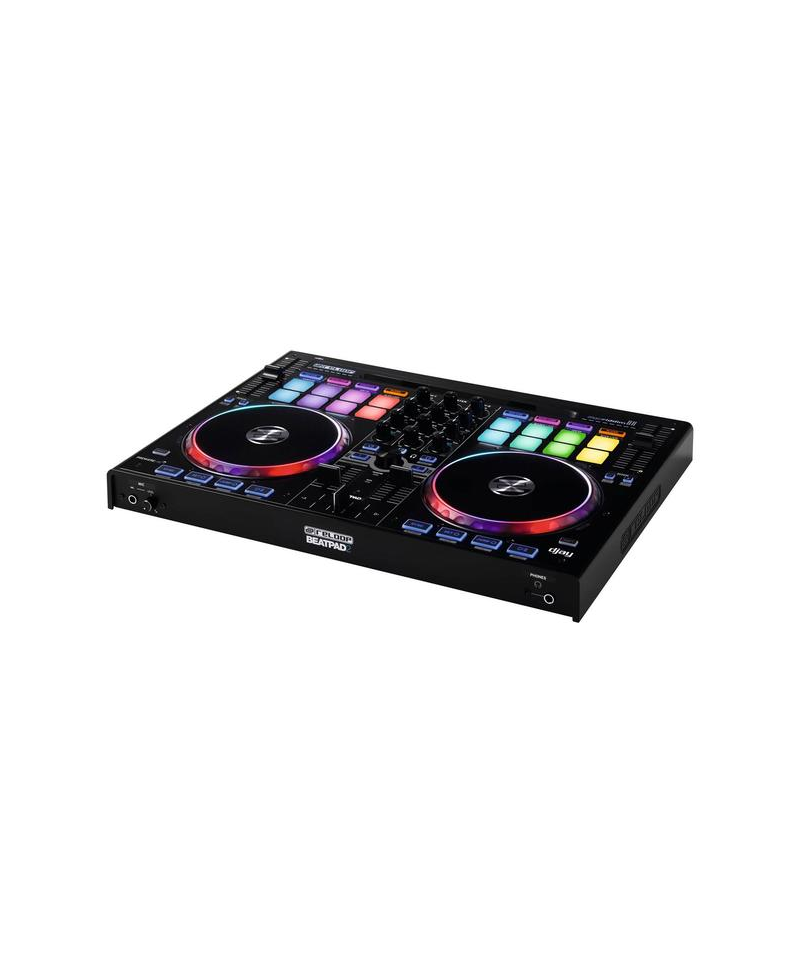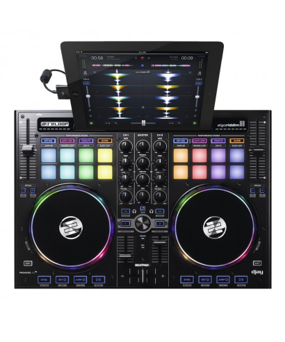 DJ Controller for iOS, Android and Mac computer devices with integrated audio interface, optimized for use with the Djay 2 by Algoriddim app. Characteristics Control surface: 63 "Full size" MIDI controls with double function (27 buttons, 5 faders, 1 encoder with push, 12 knobs, 2 jog Wheels sensitive to touch, 16 drum pad), illuminated buttons, jog wheels and drum multicolored illuminated pads, filter q / classic q, LED selector Dimmer. Features Audio interface: 4x4 USB interface with master outputs in XLR and RCA format, 1 6.3 mm microphone input and gain control, AUX input in RCA format with phono / line selector, headphone output with dedicated volume control in 6.3 mm jack format and 3.5 mm jack. Native compatibility with iOS devices equipped with Lightning port (OS7 or higher), Android devices and Macintosh computers (PC drivers available via download). Usable with any DJ software equipped with MIDI LEARN support,