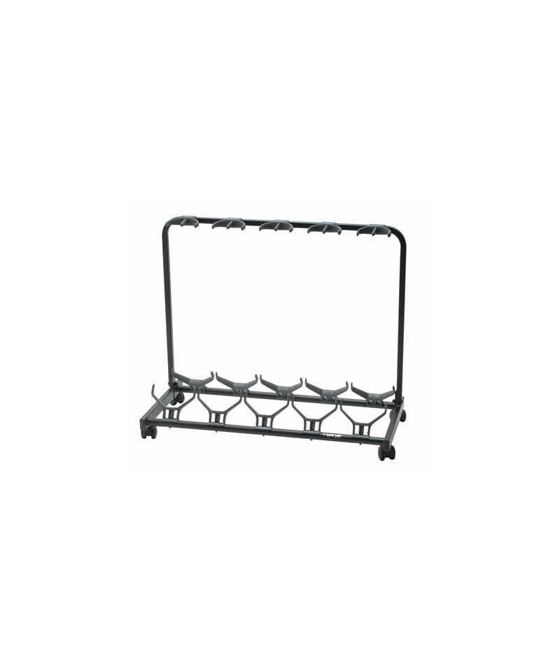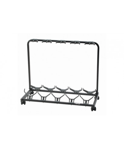 Universal support multiple For 5 guitars. The lower part of the supports is shaped to adapt to any type of acoustic or electric guitar and are covered with a layer of soft rubber hold the instrument locked, without the risk that painting is damaged. The design of the handle support makes it possible to position the guitar in both sides. Ideal on stage and studio, but also for display of instruments in shops or fairs. Equipped with wheels (two with brake) to favor mobility and closely closes by favoring an easy transport.