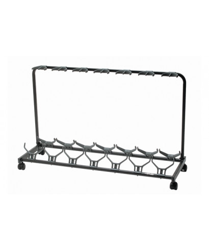 Multiple universal support for 7 guitars. The lower part of the supports is shaped to adapt to any type of acoustic or electric guitar and are covered with a layer of soft rubber hold the instrument locked, without the risk that painting is damaged. The handle support design makes it possible to position the guitar in both sides.