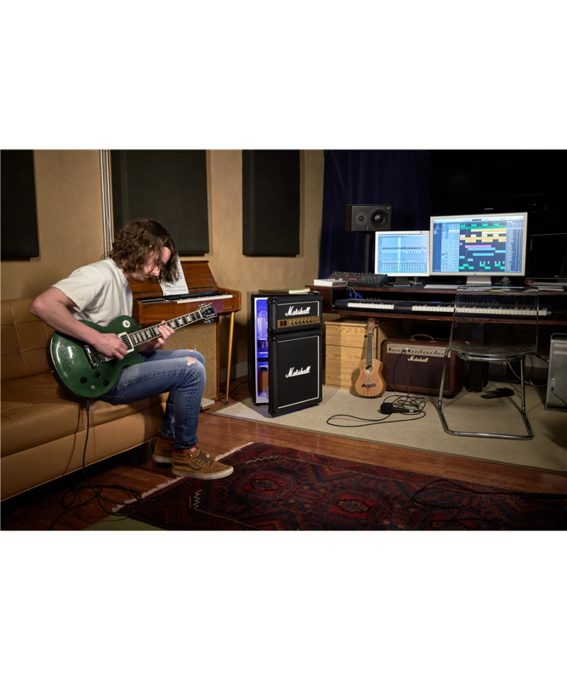Do you think it's a new Stack Marshall amplifier ?? No. E'A fantastic furnishing fridge. Marshall, always attentive to news, after the success of Major and Minor, has catapulted into the world of furniture and design objects. The Marshall Fridge is a compact fridge that faithfully resumes the design of Marshall amplifiers that have made rock history. In the kitchen, in the test room, in the studio, in the store, on stage or wherever you want, think that scene when you open your amplifier "to take something fresh to drink or eat.