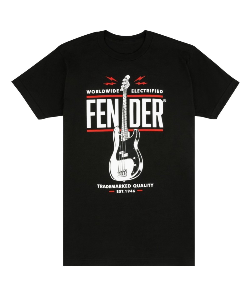 Celebrate the lasting influence of the b bass with this t-shirt. This elegant shirt brings a surprising image of the original electric bass, along with the slogans "Worldwide Electrified" and "Trademarked Quality Est. 1946." There is no better way to celebrate the low end.