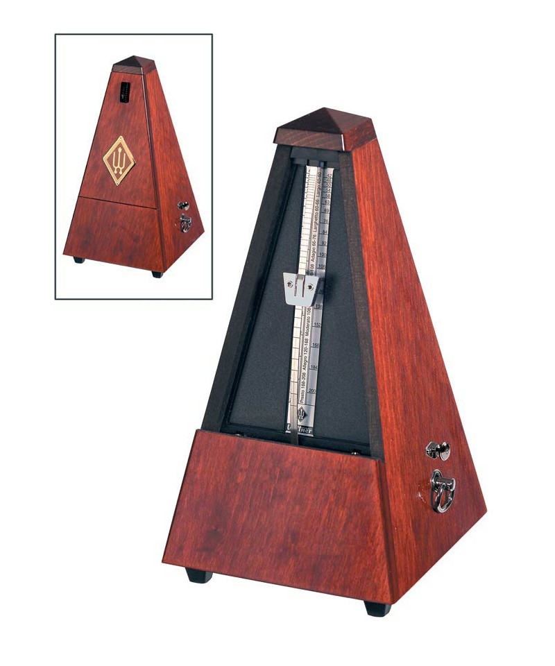 Mechanical metronome with bell, pyramid-shaped wooden casing, mahogany color, opaque finish