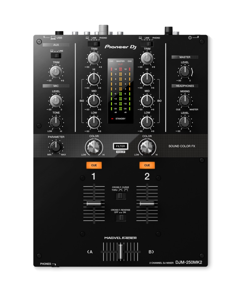 The DJM-250MK2 inherited some of the professional features of the popular DJM-900NXS2, such as the MAGVEL crossfader and FX color Sound filter. Simple controls, a clear layout, and the dedicated 3-band isolators allow you to scratch and mix instinctively. Dithhering technology on this mixer produces a hot, high quality audio from both analogical and digital sources. Also your built sound card-In Allows you to connect the mixer to the PC / Mac and use RekordBox DJ to perform with CDJ. Or you can connect the DJM-250mk2 turntable and use DVS RekordBox in combination with scratchar control vinyl and mix digital files stored on the computer.