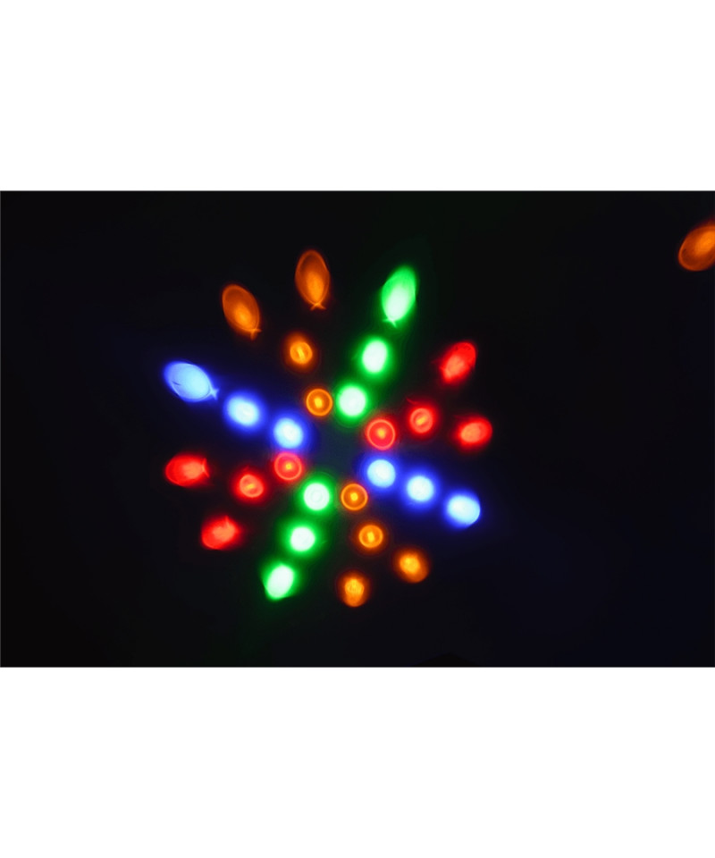 - Bright sources: 9 red LEDs 1W, 9 LED green 1W, 9 blue LED 1W, 9 UV 1W LEDs, 24 red LEDs 75mW, 18 green 75mW LEDs, 18 75mW blue LEDs, 24 LED amber 75MW, 12 LED strobe 0.5 W
