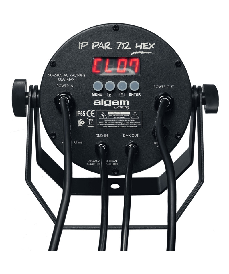 IP-Par-712-HEX The LED par with Algam Lighting with built-in DMX protocol and IP65 certification that allows us to use it in external environments. Resistant to splashes of water and dust, IP-Par-712-HEX equipped with 7 LEDs from 12W each that allows to merge RGBwauv colors and distribute them with an angle of 40. Perfect to create atmospheres with facilities, this projector can operate in automatic mode, reacting to music Environmental, to be controlled by a DMX controller or a device
