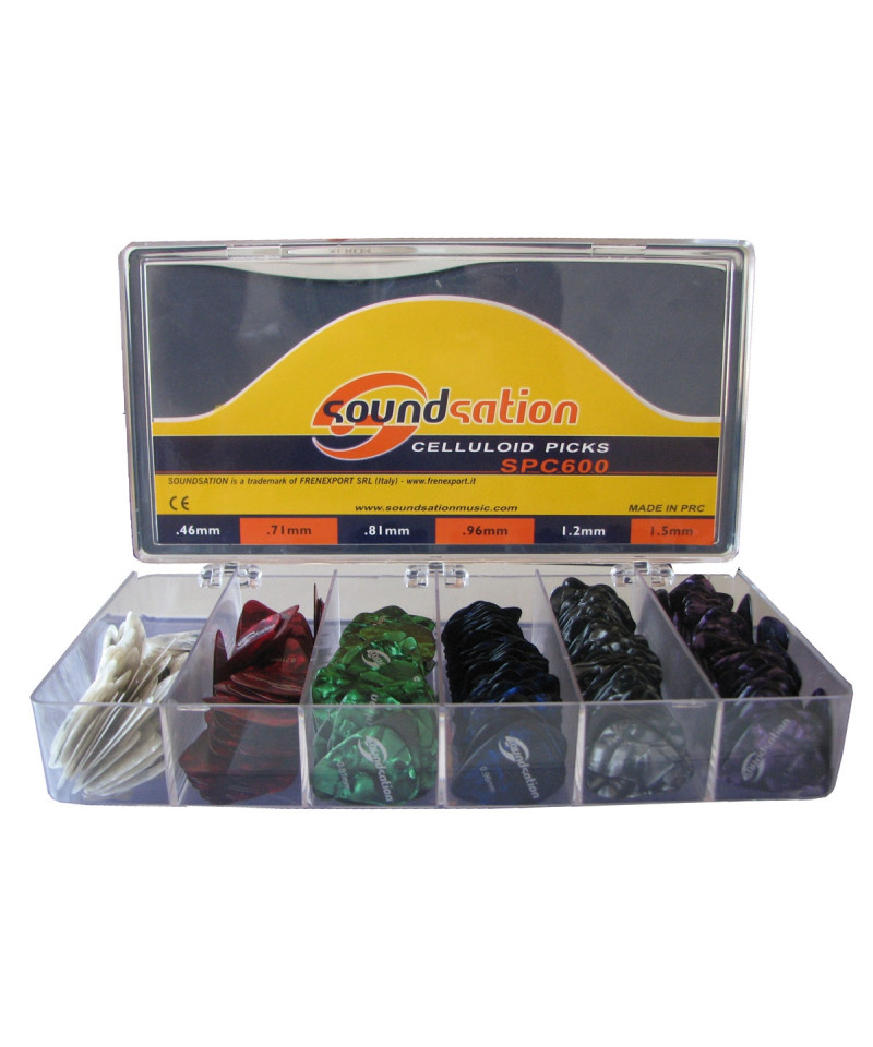 A practical and captivating box containing 600 plettri in celluloid. 100 pieces for every thickness divided into 6 sectors (0.46 - 0.71 - 0.81 - 0.96 - 1.20 - 1.50).