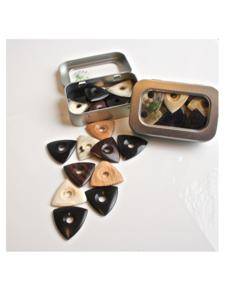 Pack of 20 plettri designed for lovers of the heavy plettrate '. They are made in different materials (ebony, rosewood, birch, black and white horn). The three large tips make these plettres ideal for the Jazz or electric bass gypsy. Anodized metal box. A great gift for any guitarist.