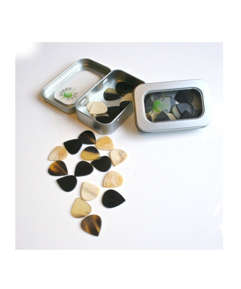 Pack (anodized metal box) from 24 plated Jazz Tones series, shaped on the classic 'Jazz III' shape, but thicker than 2 mm with a bevel in both sides of the tip. They are products in bone, horn or mother-of-pearl, for fast but accurate pen. The best gift for a jazz guitarist.