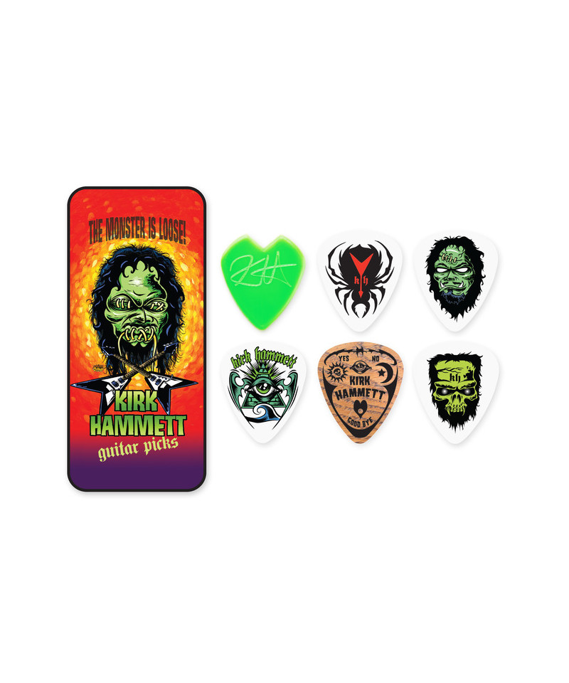 The art of Dirty Donny presents the Kirk Hammett plettri, of which 5 pcs characterized with unique images inspired Axe-Wielding of metallic and 1 Picture modeled after one of his tours.